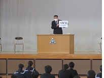 本日、生徒会入会式を行いました。今年度も、体育館には1年生だけが集合して、生徒会執行部の生徒が、スライドを使って、学校行事や生徒会組織について説明を行いました。1年生はこの説明を聞いて、役員決めを行います。入会式の後に、1年生にとって、とても楽しみであり、重要な部活動紹介を行いました。部活動紹介も新型コロナウイルス感染症防止のため、各部の出番だけの参加となりました。各部とも素晴らしいパフォーマンスを見せてくれました。