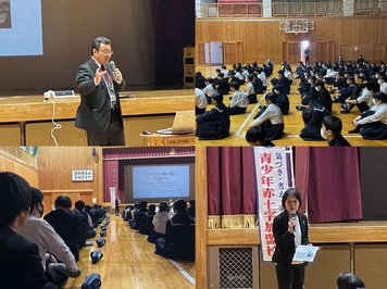 本日の5校時、JRC(青少年赤十字)賛助奉仕団の川津様と日本赤十字社島根県支部の好田様の2名をお招きして、JRC登録式を行いました。