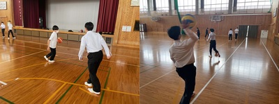 体育館では、男子がバスケットボールやドッヂボールをして遊んでいました。