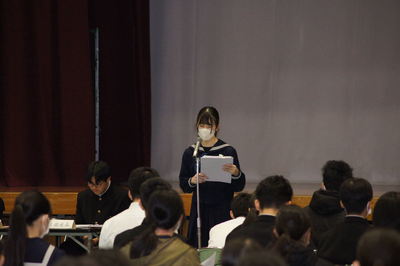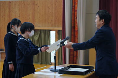 12月25日、2学期最終日に三つの式を行いました。はじめに先日決まった新生徒会長と副会長の任命式を行いました。任命後、新生徒会長より全校生徒へ所信を表明するあいさつがありました。続いて、しまね数リンピック、人権作文コンクール、毛筆書写コンクール、アンサンブルコンテストなどの表彰式を行いました。