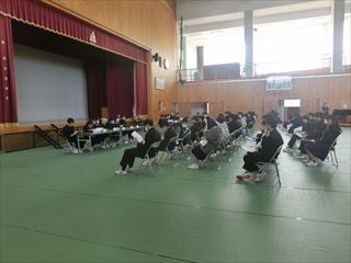 さて、学校では始業式を行うにあたり、大掃除で校舎をきれいにしました。その後、全校生徒が体育館に集い始業式を行い、いよいよ3学期が始まりました。続いて、生徒会新執行部の任命式を行いました。生徒会長が抱負を述べました。皆元気で、活躍してくれることを願っています。(写真は任命式の様子です。)